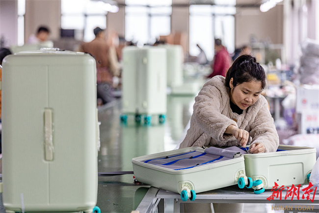 The photo, taken on February 24, shows workers busy at a suitcase company in the Garment Industrial Park in Jishou Economic and Technological Development Zone. That day marked the first working day after the Spring Festival holiday. Local enterprises resumed production, striving to get off to a good start. (Photo/Peng Jing)