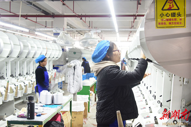 The photo, taken on February 24, shows workers busy on a production line of a knitting company in Jiahe County High-tech Industrial Development Zone, Chenzhou City. That day marked the first working day after the Spring Festival holiday. Local enterprises resumed production, striving to get off to a good start. (Photo/Huang Chuntao)