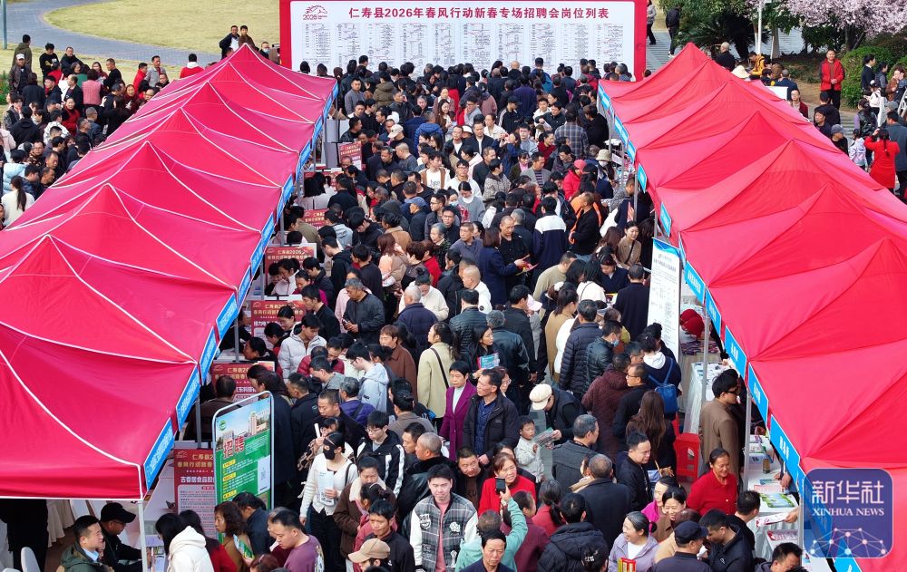 ↑ 这是2月25日在四川省眉山市仁寿县拍摄的2026年春风行动新春专场招聘会(无人机照片)。新华社发(潘建勇摄)