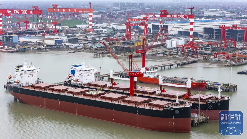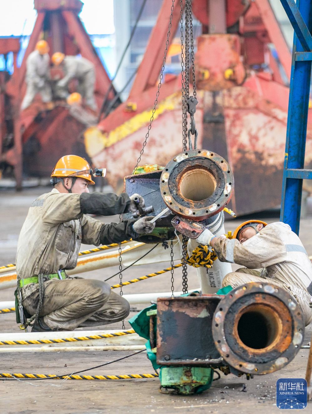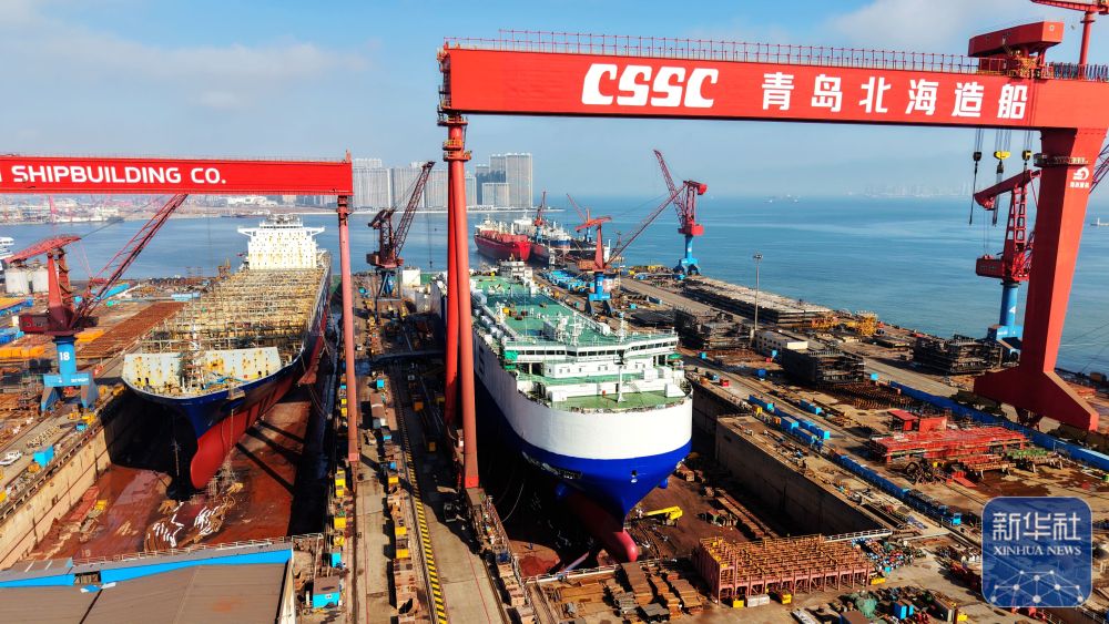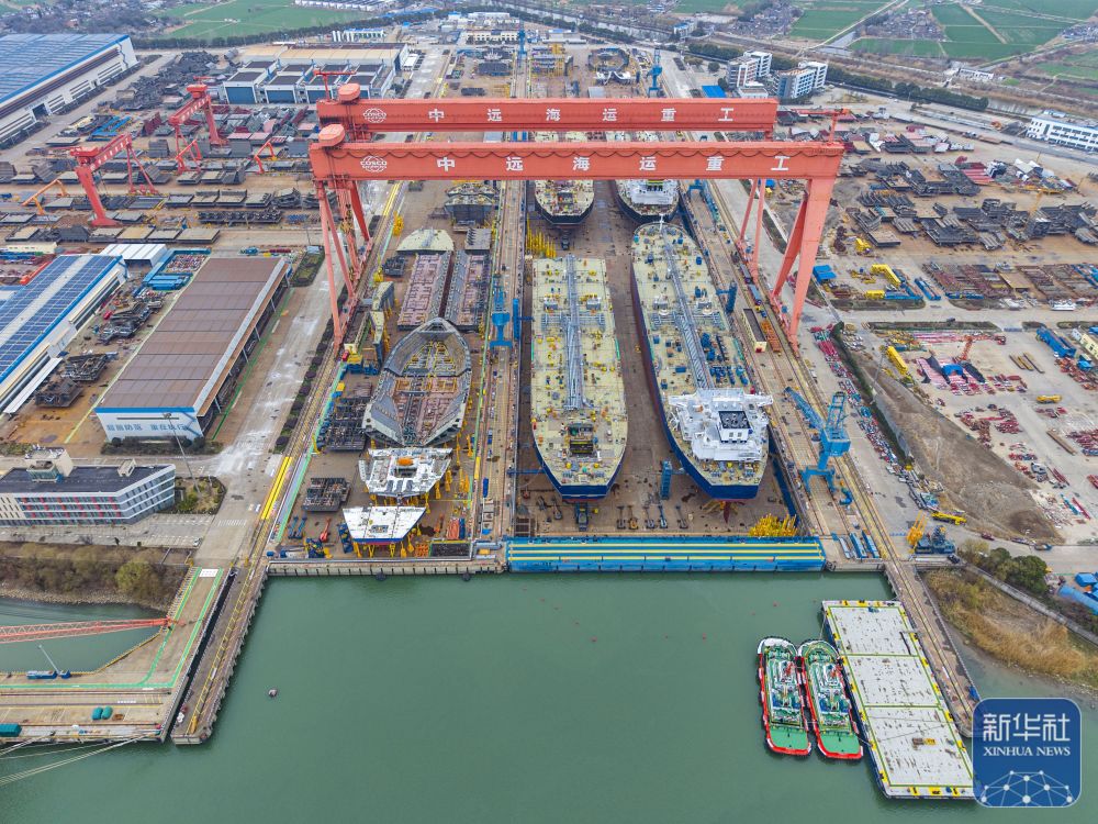 ↑ 2月25日,在位于江苏省江都经济开发区的扬州中远海运重工有限公司生产厂区,工人在加紧生产大型船舶(无人机照片)。新华社发(任飞摄)