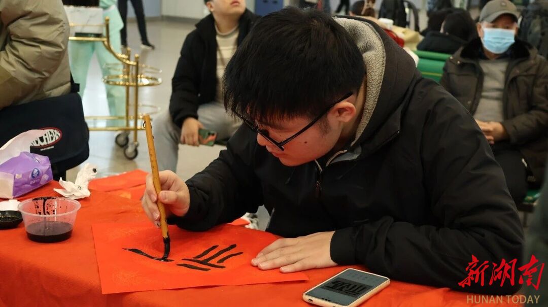 春运首日,湖南高速铁路职业技术学院铁道电信学院的师生志愿者们携手衡阳东站工作人员,在候车大厅内精心策划了一场“情暖归途 福至万家”主题服务活动。候车厅里,志愿者们摆开笔墨纸砚,秒变“送福达人”,为旅客现场书写春联与“福”字。志愿者王同学以一手遒劲有力的隶书吸引了众多旅客驻足,短短两小时内,志愿者们共送出春联60余幅、“福”字百余张。带着孩子返乡的李女士小心翼翼地收好春联,笑着说:“本来候车挺无聊的,没想到还能领到手写春联,墨香扑鼻,比印刷品有意义多了,感觉年味儿一下子就浓了!”