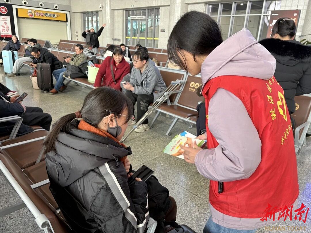 在永州火车站,冷水滩区组织的春运暖冬志愿服务活动从2月初持续至3月9日,实行两班轮转制度,早班8:00至14:00、晚班14:00至20:00,全程覆盖春运客流高峰时段。这意味着,无论是节前返乡还是节后返程,旅客都能看到那一抹温暖的“志愿红”。