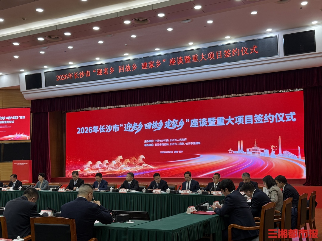 2月25日,长沙市会议中心内,海内外湘商精英、杰出校友、院士专家共赴2026年长沙市“迎老乡 回故乡 建家乡”座谈暨重大项目签约仪式。这是长沙连续多年深耕湘商回归的品牌延续,更是新春开局之际,向全球湘商发出的诚挚邀约:家乡长沙以优质的营商环境、实实在在的产业机遇,静待游子归巢。