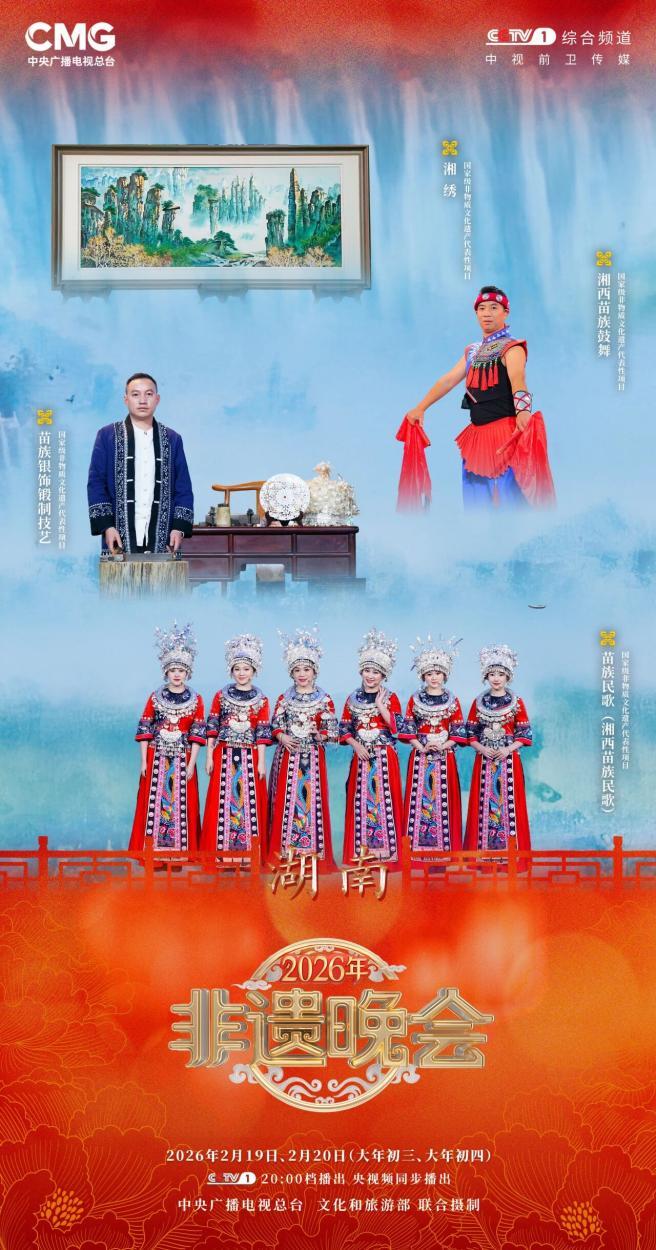 《湘韵银辉》节目深度融合苗族银饰锻制技艺、湘西苗族民歌等多项非遗元素,而《张家界》则以湘绣独有的艺术张力,将自然奇观与湖湘文化的精神内核凝于方寸之间,铺展满目光华。此次湘绣作品以舞台视觉背景形态,登上央视非遗晚会,也是一个从非遗“陈列”走向文化“对话”的鲜活注脚,绽放出璀璨的光彩。
