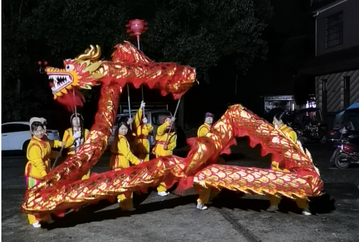 “刚开始练的时候,龙头重得抬不起来,动作东倒西歪。”何国辉笑着回忆,“练‘首尾相衔’的动作时,因为一个队员站错位置,龙身缠成‘麻花’,大家没气馁,而是笑着拆解动作,反复练习,直到深夜才练顺。”