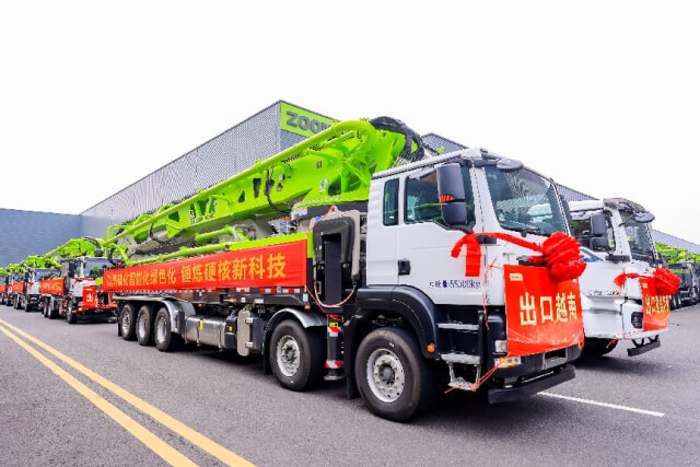 (中联重科产品发车奔赴全球。 通讯员供图)