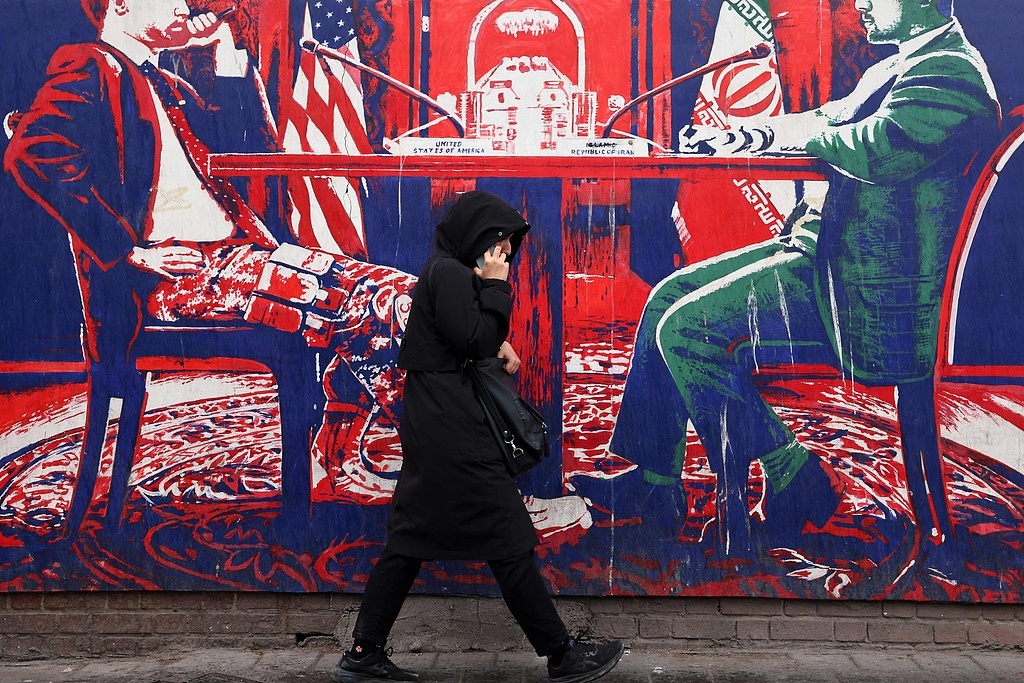 △伊朗德黑兰,一名女子在走过前美国大使馆外墙上被称为“间谍巢穴”的壁画(资料图)