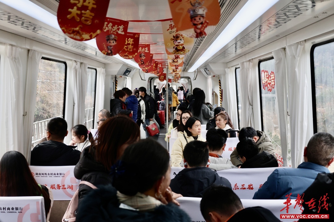 春节前,凤凰磁浮从运营调度、安全管控、服务优化三方面系统部署,联合凤凰农商银行推出春运暖心行动,连续8天每日开行5趟免费专列,返乡群众与外地游客无需购票,即来即走。同时,针对返乡出行与旅游观光叠加形成的客流高峰,动态调整运营时间和行车间隔,加密安全巡查,增派服务人员,保证运力。