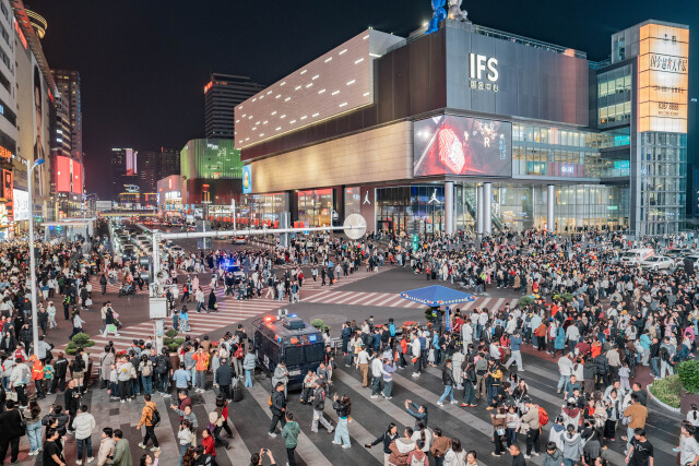 以五一大道与蔡锷南路交会的十字路口为中心,方圆约3公里范围就是五一商圈,这是长沙“心跳”最快的地方。这里聚集了超20家大型购物中心,日均客流量超50万人次,商业密度堪比全球知名度最高的商圈东京新宿。
