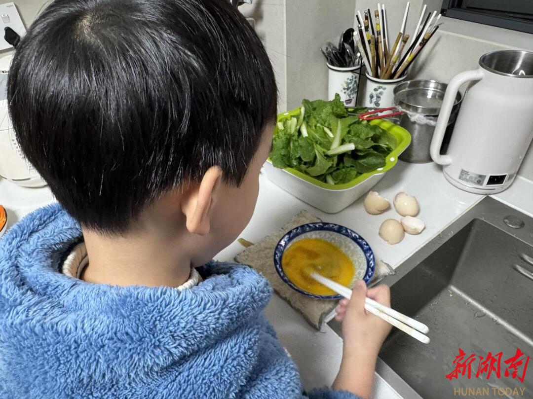 接下来是打鸡蛋。我从冰箱里拿出四个鸡蛋,用水洗干净,在碗边轻轻一磕,蛋壳裂开一道小缝,用双手一掰,金黄的蛋液 “扑通”一声滑进蓝白花纹的碗里。我拿起筷子,手腕快速转动,筷子在碗里划出一道道金色的弧线,蛋液渐渐变成了均匀的黄色,像小太阳一样闪着光。旁边的小青菜绿油油的,等着和鸡蛋做搭档,这可是年夜饭桌上的“春色”呢。