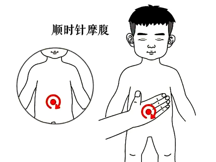 家长手掌搓热,以孩子肚脐为中心,顺时针轻揉腹部 3-5 分钟