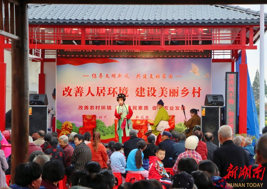 南县麻河口镇德和垸文化广场“村规民约亭”正在上演移风易俗主题花鼓戏。 赵园 摄