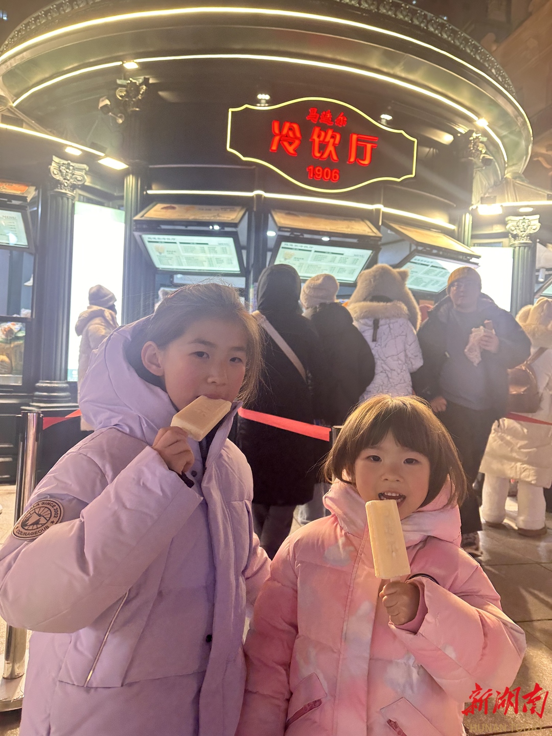 饭后,我们全副武装裹的像个粽子,在零下二十度的夜晚,来寻找马迭尔冰激淋,我们大口大口地吃,作为游客还在冰激淋店的门口留下了几张打卡照片,吃着冰激凌,沿着中央大街,我们散步回了酒店。