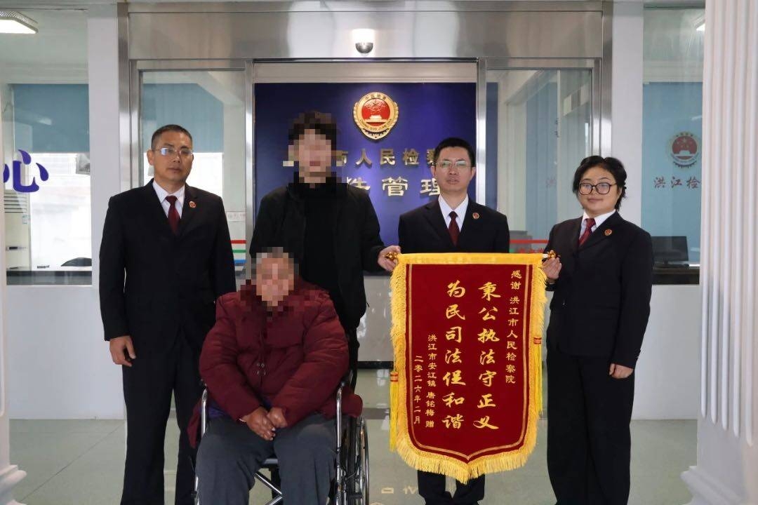 “今年我和我妈商量,一定要在上班第一天亲自过来,当面表达我们的谢意。”2月24日,是马年春节假期后上班第一天,洪江市人民检察院检务大厅里,唐某梅坐着轮椅,在儿子肖某月的陪伴下缓缓而入。母子二人手中捧着一面鲜红的锦旗,上面印着“情系百姓解民忧 司法为民显温情”十四个大字。