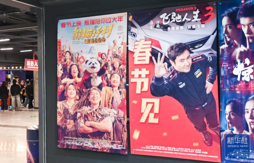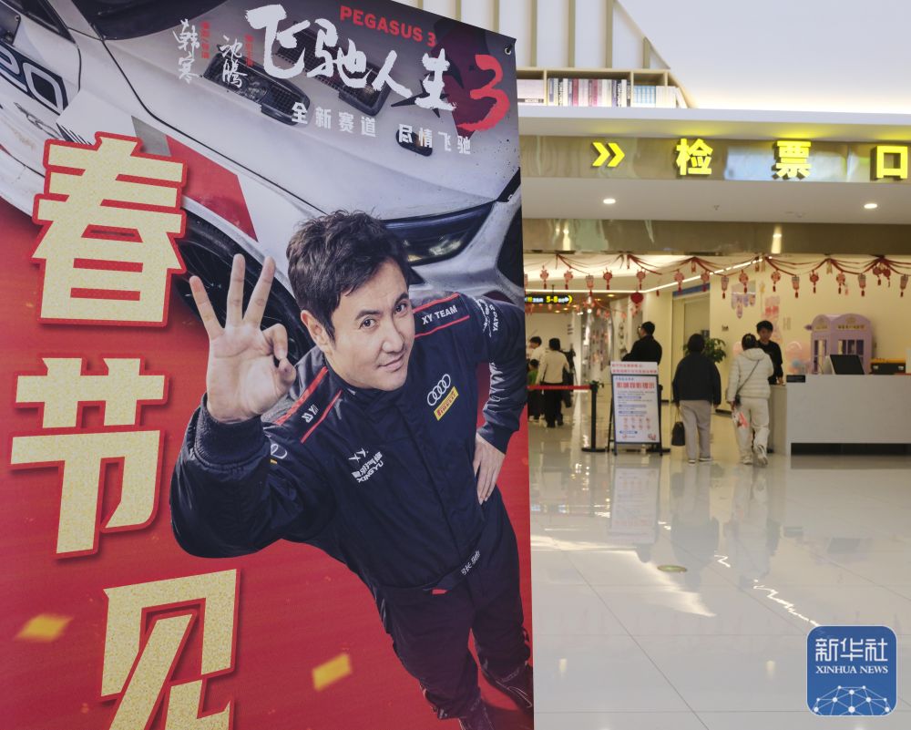 ↑ 2月20日,在山东省青州市一家影城,观众从电影海报旁经过。新华社发(王继林摄)