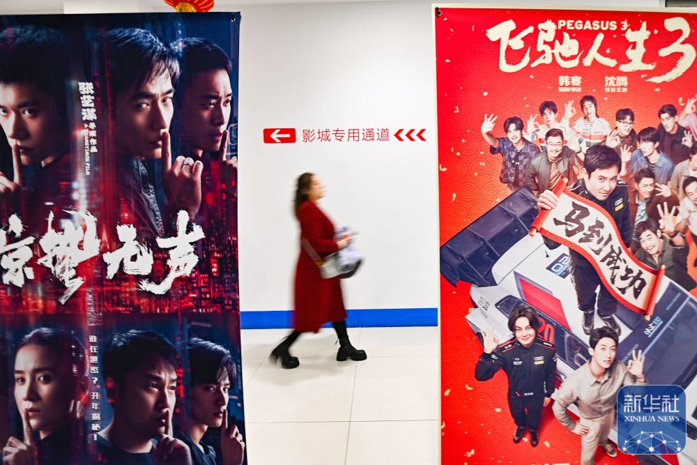 ↑ 2月23日,在江苏省连云港市连云区一家影城,观众从电影海报旁走过。新华社发(王春摄)