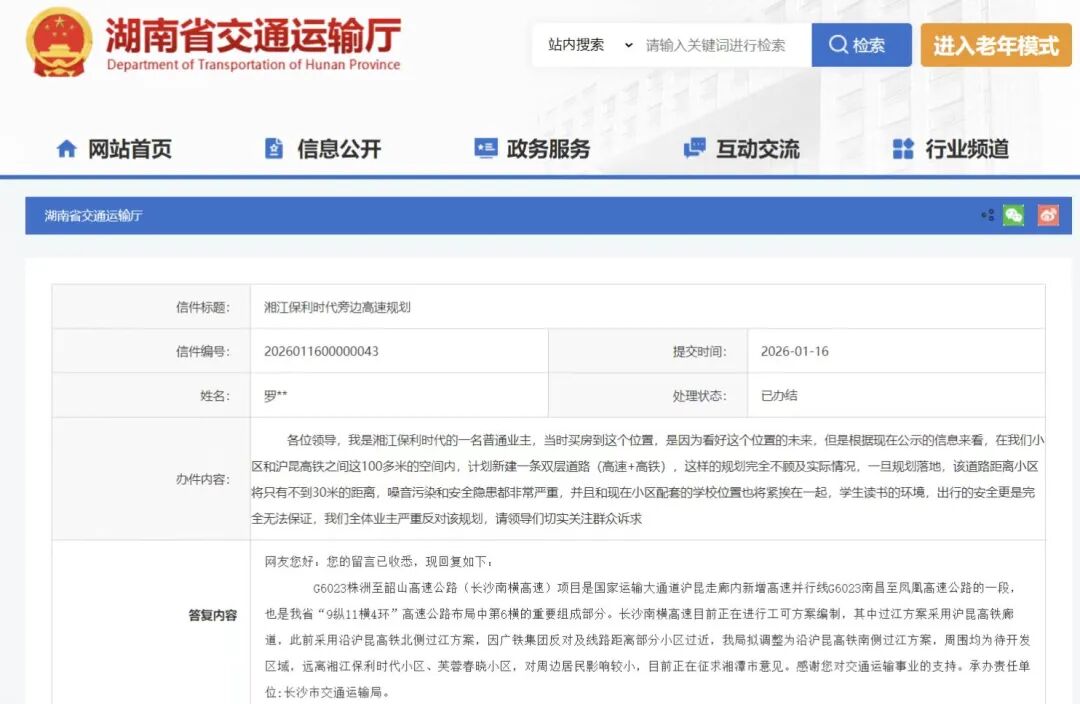先看看省交通厅的回复:“长沙南横高速目前正在进行工可方案编制,其中过江方案采用沪昆高铁廊道,此前采用沿沪昆高铁北侧过江方案,因广铁集团反对及线路距离部分小区过近,我局拟调整为沿沪昆高铁南侧过江方案”。