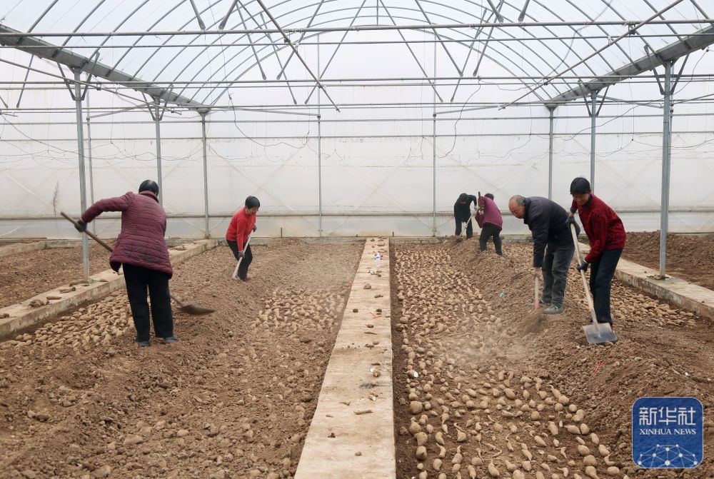 ↑ 2月25日,河南省洛阳市汝阳县刘店镇沙坪村村民在温棚内培育优质红薯苗。新华社发(康红军摄)