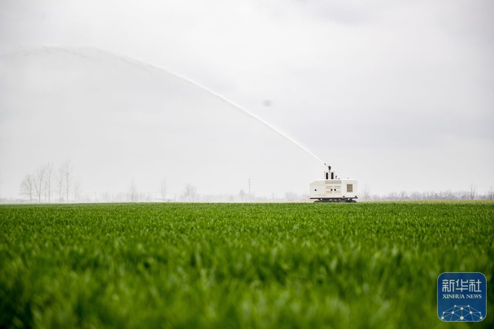 ↑ 2月24日,在河南省商丘市睢县后台乡一处农田内,无人智能灌溉机器人进行水肥一体化喷灌作业。新华社发(徐泽源摄)