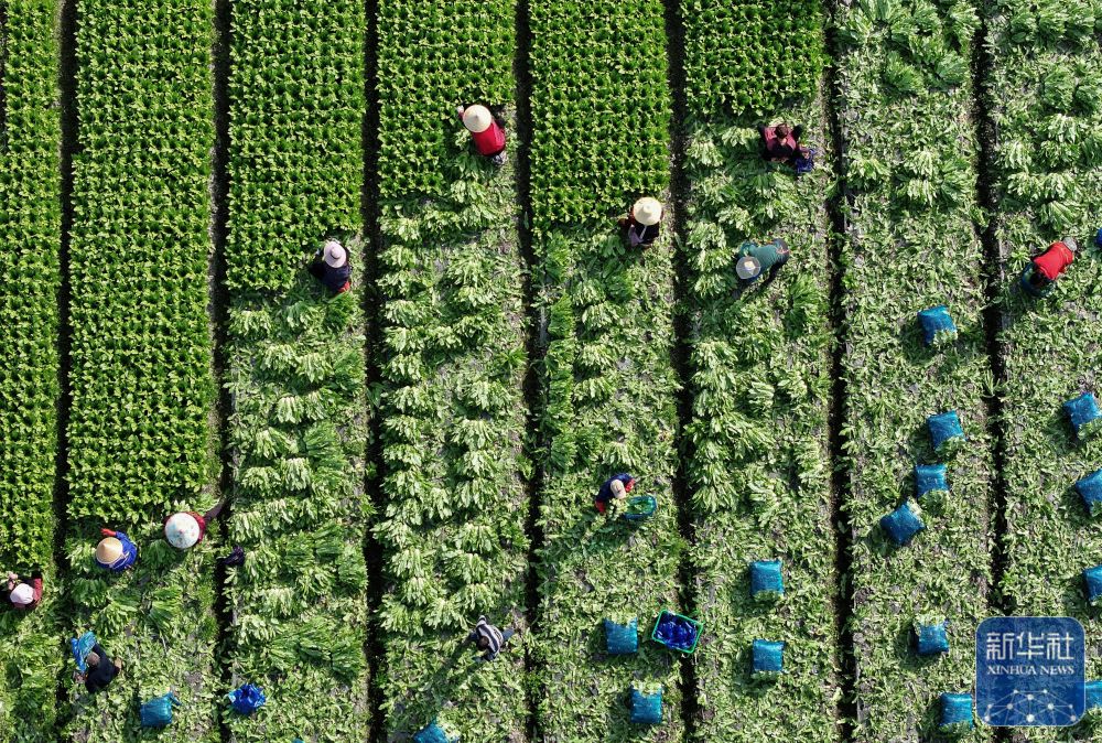 ↑ 2月24日,农民在四川成都市彭州市九尺镇玉源社区的田地里采收油麦菜(无人机照片)。新华社发(罗国杨摄)