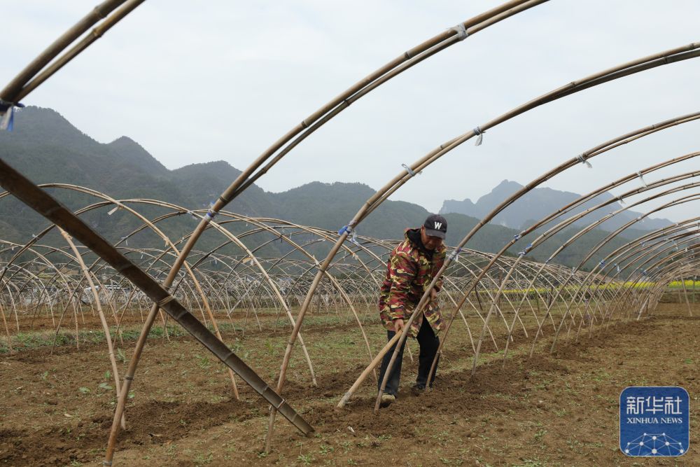 ↑ 2月24日,在贵州省铜仁市江口县闵孝镇哨上社区,村民在整理西瓜种植大棚。新华社发(李鹤摄)