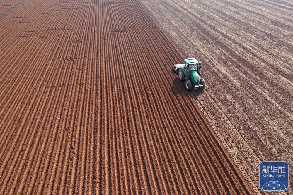 ↑ 2月24日,河南省沁阳市柏香镇期城村,农民驾驶农机在田间整地(无人机照片)。新华社发(杨帆摄)