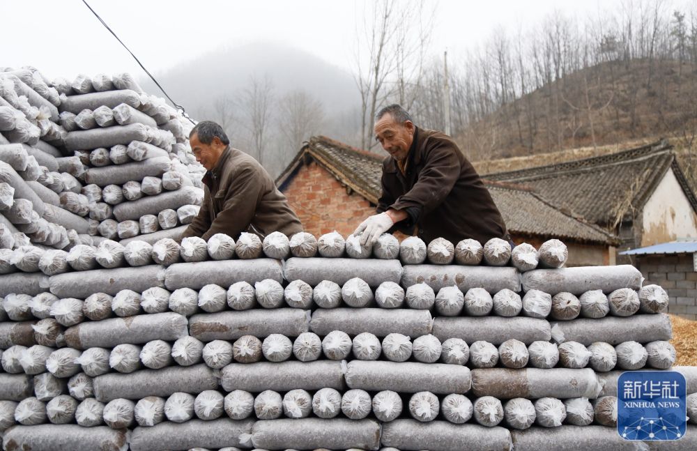 ↑ 2月25日,河南省洛阳市汝阳县王坪乡大庄村村民在搬运袋料香菇。新华社发(康红军摄)