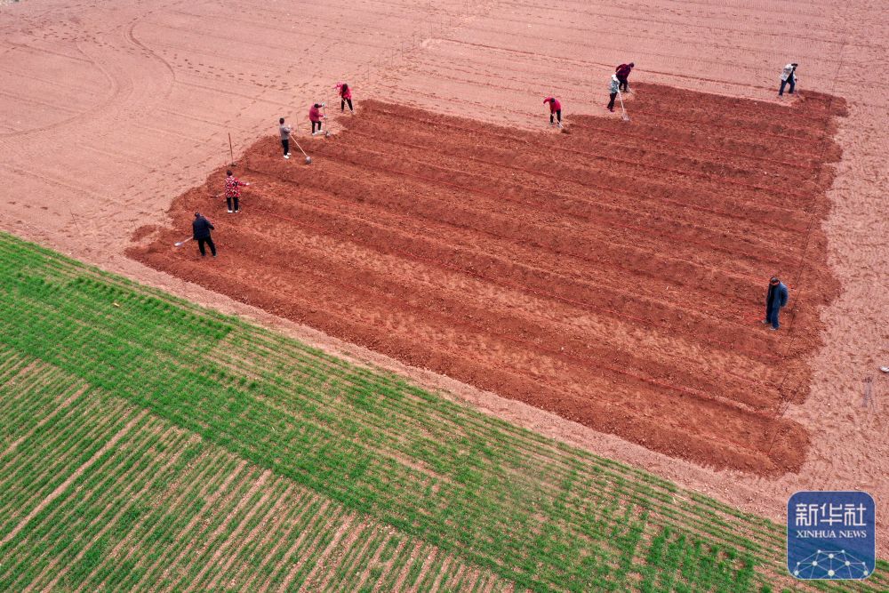 ↑ 2月25日,河南省沁阳市王曲乡东王曲村,农民在田间整地作畦(无人机照片)。新华社发(杨帆摄)
