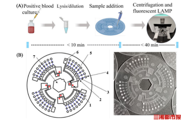 外形酷似CD唱片的芯片,将复杂的实验室检测流程浓缩于方寸之间。检测时,操作者仅需从已培养阳性的血培养样品中提取5微升样本进行裂解处理,再用移液器将60微升处理后的混合液注入芯片。随后将芯片置于特制离心机中,通过精确控速的离心步骤使样品均匀分布,经过恒温孵育和便携式荧光检测仪读取结果,全程仅需50分钟。