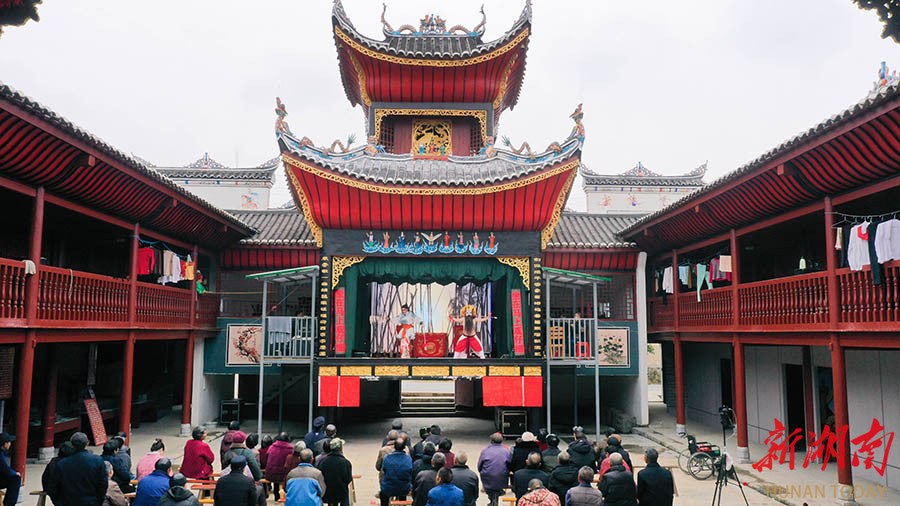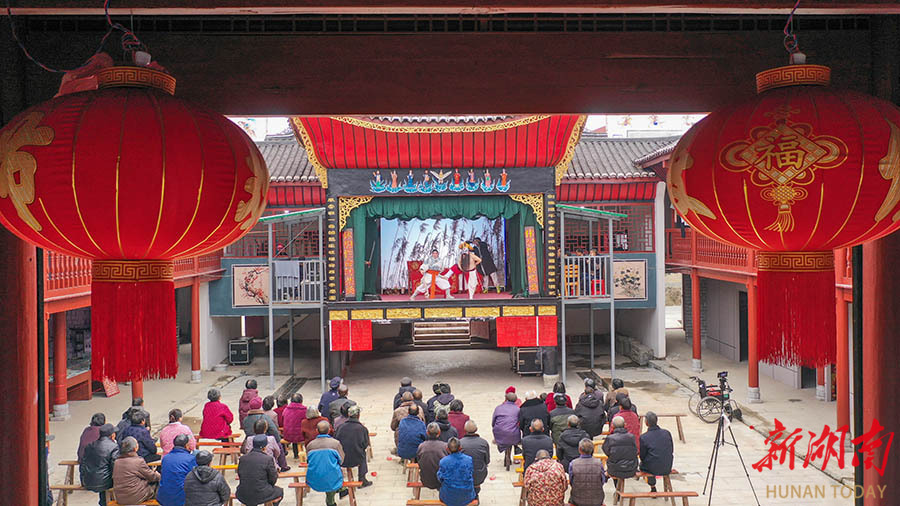 2月25日,洞口县山门镇路边村刘怡公祠,演员在表演祁剧。自正月初六起,当地村民自发筹办为期半个月的祁剧演出,以悠扬戏韵丰富春节文化生活。 曾勇 摄(湖南图片库)