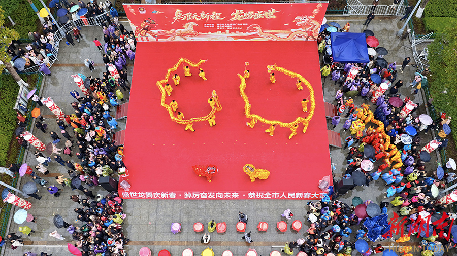 2月28日,常宁市8个乡镇的民俗表演队在市政广场举行元宵节预热活动。尽管春雨绵绵,舞龙舞狮、古装剧等传统节目仍吸引众多市民驻足观赏,营造出浓厚的节日氛围。 刘东华 摄(湖南图片库)