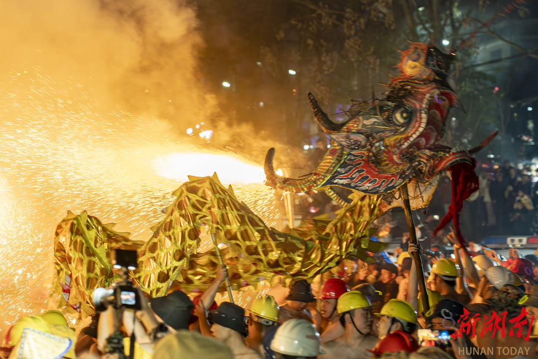 共庆元宵,祈愿新岁安康。湘西钢火烧龙在湘西土家族苗族自治州吉首市马颈坳镇热闹上演,火树银花把夜空点亮,乡亲们和游客围在一起,在飞溅的钢火里祈愿新的一年风调雨顺,平平安安。