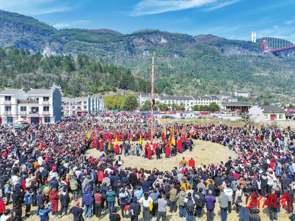 2月20日,吉首市大兴寨水库移民矮寨安置区,上刀梯、苗鼓、苗歌等苗族传统民俗轮番上演,新春年味别样浓。