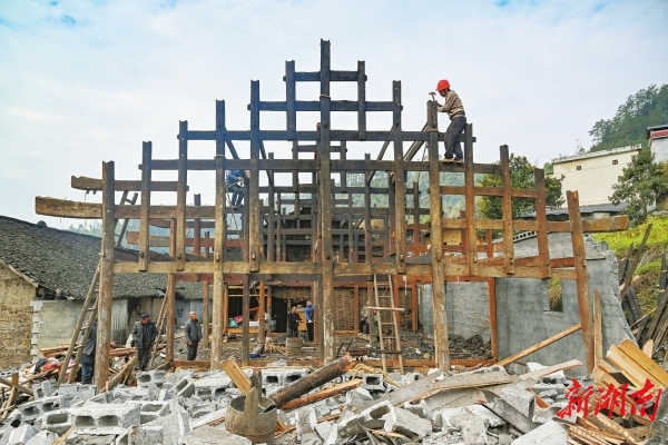 2025年3月16日,吉首市矮寨镇吉龙村,施工人员对移民群众的旧木房进行拆除。