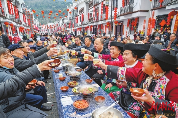 3月3日,农历正月十五,吉首市大兴寨水库移民矮寨安置区举行“金马迎春花灯俏 移民新寨庆团圆”联欢活动,移民群众欢聚一堂吃长桌盛宴,庆祝元宵佳节。