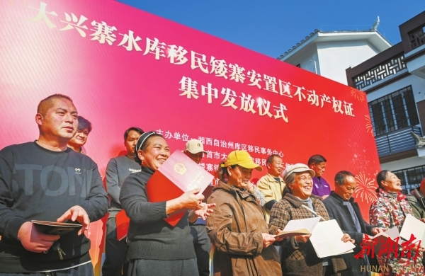 2025年12月18日,吉首市举行大兴寨水库移民矮寨安置区不动产权证集中发放仪式,55户安置户喜领“红本本”,实现从“住有居”迈向“产有权”。