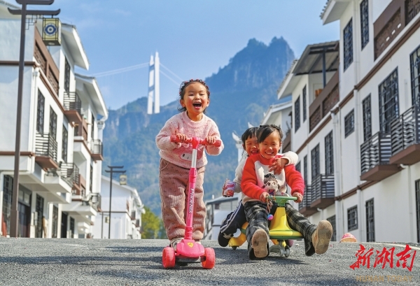 1月23日,吉首市大兴寨水库移民矮寨安置区,小朋友在新家门口开心玩耍。