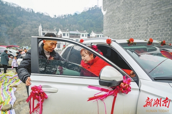 1月31日,吉首市大兴寨水库移民矮寨安置区,原聚福村移民施兴旺和妻子龙银金搬入新家后补办婚礼。
