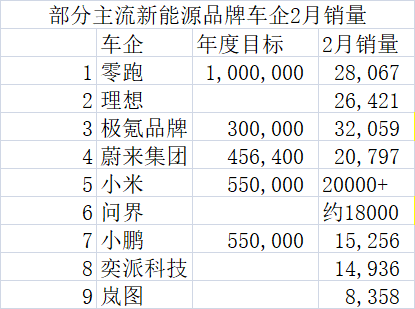 在“史上最长春节假期”后,3月1日,多家新能源车企陆续交出了2月销量成绩单。
