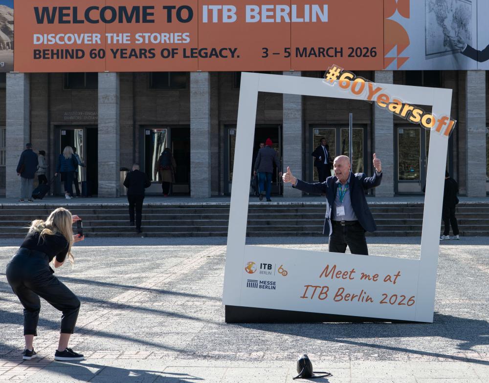 ↑3月3日,在德国首都柏林,一名男子(右)在2026柏林国际旅游交易会的一处入口外拍照留念。