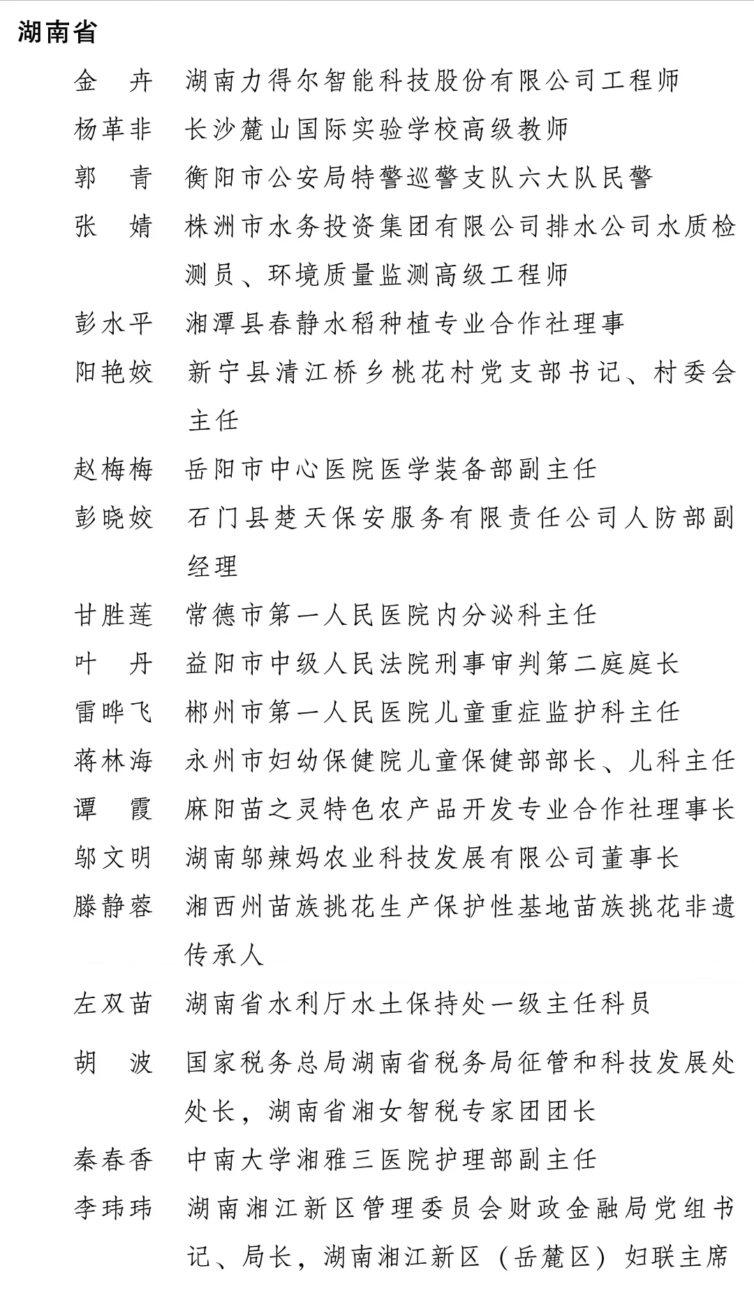 此次获得“全国三八红旗手”荣誉称号的个人包括:新宁县清江桥乡桃花村党支部书记、村委会主任阳艳姣,湘西州苗族挑花生产保护性基地苗族挑花非遗传承人滕静蓉等。她们扎根基层,在乡村振兴、文化传承等领域作出了突出贡献。具体名单如下: