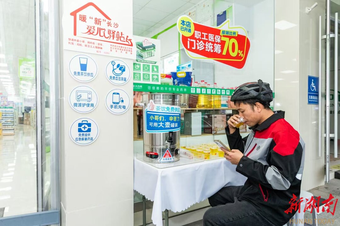 长沙市委社会工作部两企三新党建处处长任学谦介绍,2025年6月与快递外卖小哥的一次面对面交流中,外卖员一句“路过药店想用水桶打杯水”的诉求,成了爱心驿站建设的重要契机。随后,长沙迅速统一驿站标识标牌、配发标准化茶桶、制定建设指南,让爱心驿站在各大连锁药店落地生根。