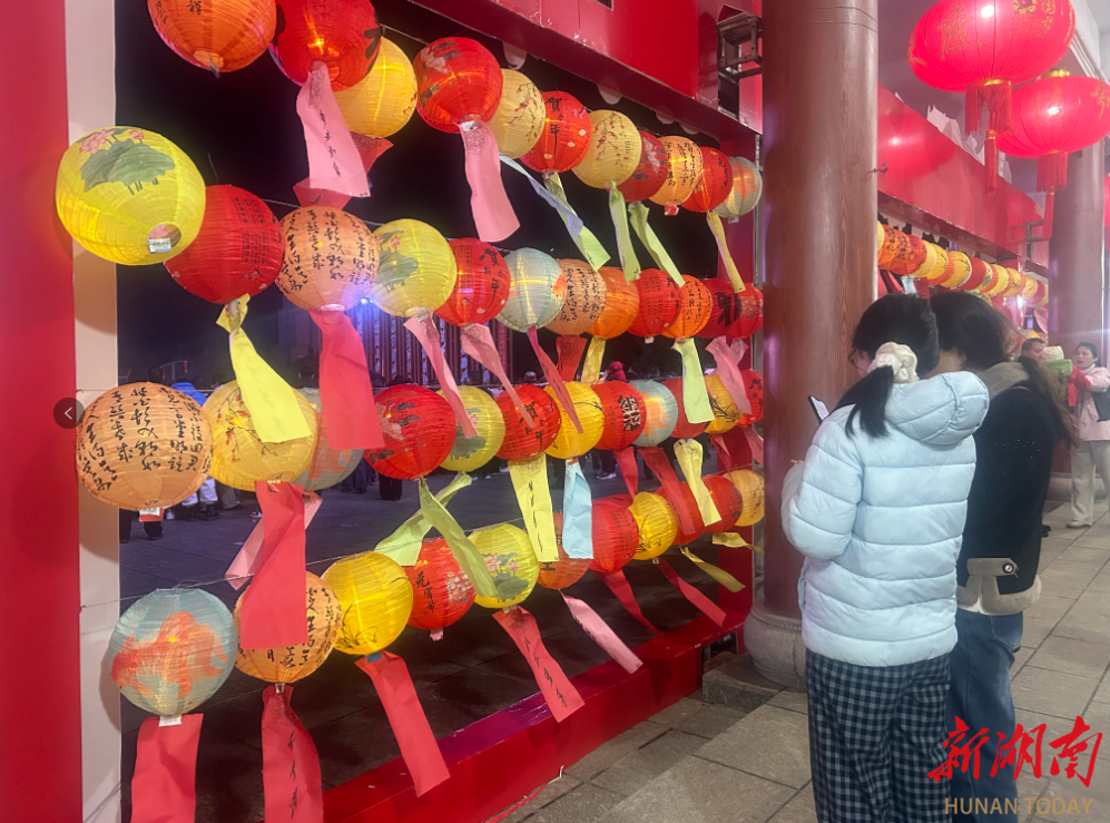 活动现场,在猜灯谜区映入眼帘的是一面14米长、2.5米宽的灯笼谜面墙,前来参加活动的观众拿着灯谜对着面前女书文字墙热烈讨论着谜底,志愿者们忙着给观众核对谜底,好不热闹。