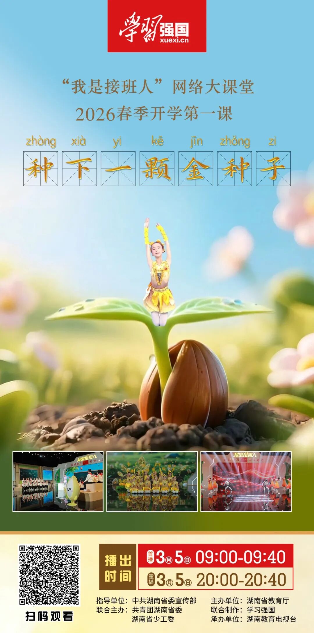 于心田萌芽创意,用实践浇灌成长。“我是接班人”网络大课堂2026新年春季开学第一课,将于3月5日在“学习强国”学习平台“推荐”频道同步播出!