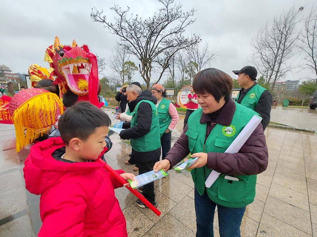 活动现场,身着喜庆服饰的少年龙灯队精神抖擞,彩龙在人群中灵活穿梭、起伏腾跃,气势十足。几名孩童手持快板清脆唱响:“爱家乡,护崀山,法律法规记心间!”朗朗上口的宣传口号,让野生动植物保护知识直达群众心底。志愿者与工作人员同步深入夫夷江国家湿地公园、崀山镇窑市村等重点区域,通过悬挂横幅、设立展板、发放资料等方式,向市民与游客科普法律法规及本地珍稀物种知识,引导公众将生态理念转化为日常行动。