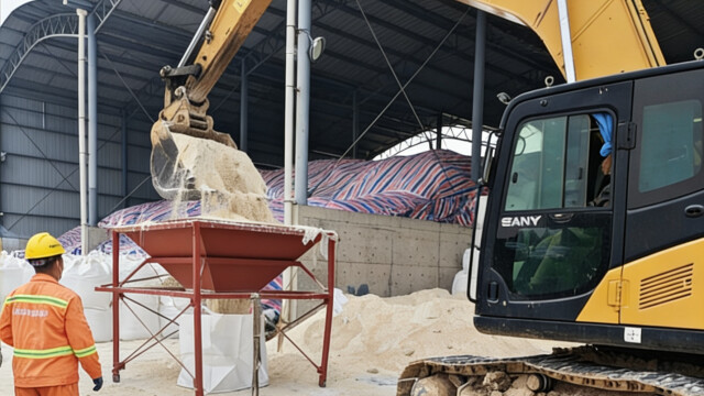 2025年底抗冰保畅工作启动前夕,项目部组织管理人员与技术骨干对这批“库存老将”开展技术攻关,最终制定了“机械破碎+精细筛分”联动处置方案。工作人员首先利用挖掘机对袋装融雪剂进行解包与初步破碎,将大块结块分解为较小颗粒。同时,针对初步破碎后的物料仍混杂未粉碎硬块及包装袋碎屑的问题,项目部自主设计并制作了一套专用的筛分器,对物料进行二次精细筛分。
