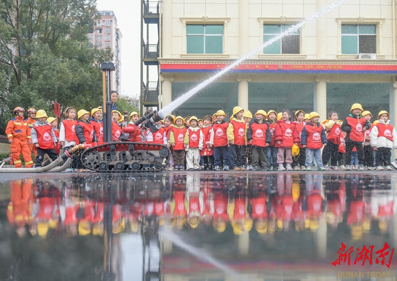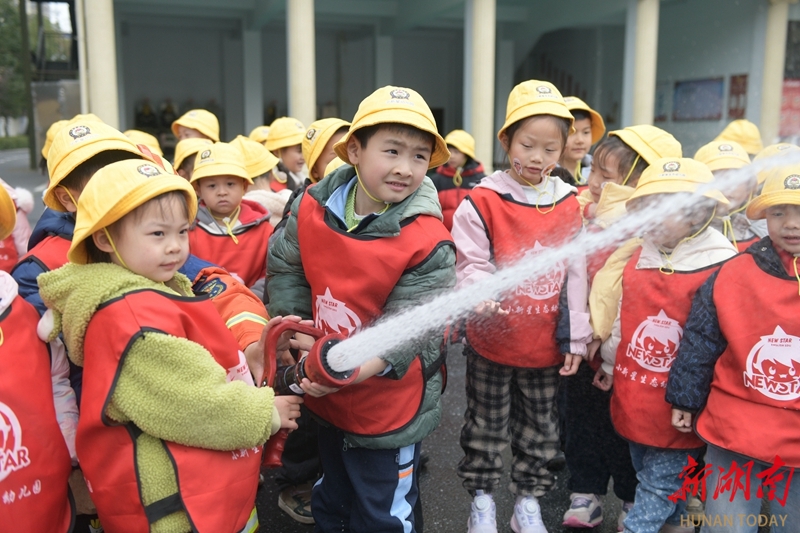 3月4日,道县消防救援大队,幼儿园小朋友在消防员的协助下体验使用消防水枪。新学期伊始,当地幼儿园、中小学校纷纷开展多种形式的“安全第一课”,帮助学生增强安全意识,提高自我保护能力。蒋克青 文甜 摄影报道(湖南图片库)