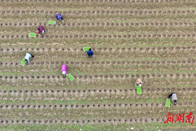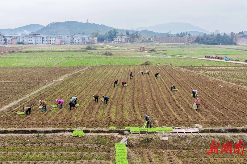 3月4日,道县梅花镇宜阳村,农民在田间移栽秧苗。惊蛰时节,当地农民抢抓农时开展春季田间管理,田野间呈现一派繁忙景象。 蒋若岚 摄(湖南图片库)