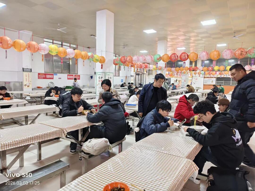 在包汤圆品汤圆环节中,师生们与食堂厨师围在一起做汤圆,共同庆祝元宵佳节;赏花灯猜灯谜的环节,数百盏灯笼悬挂在体育馆中央,一张张灯谜纸条在人群涌动中飘动,该校师生在趣味解谜中深化对传统文化的理解与认同。