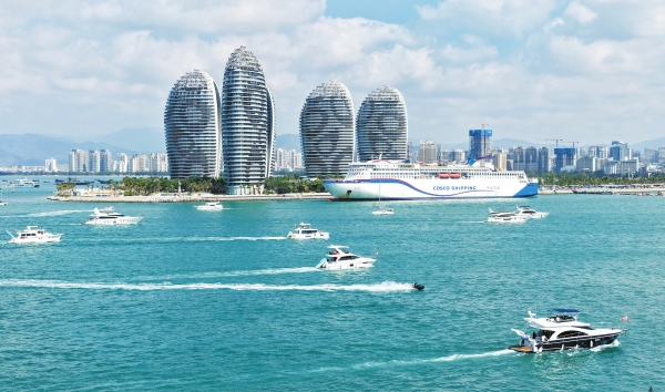 海南自贸港封关运作后首个春节,海南省三亚市游艇旅游热度不断攀升。图为2月21日,游客在三亚乘船游玩(无人机照片)。新华社记者 赵颖全 摄